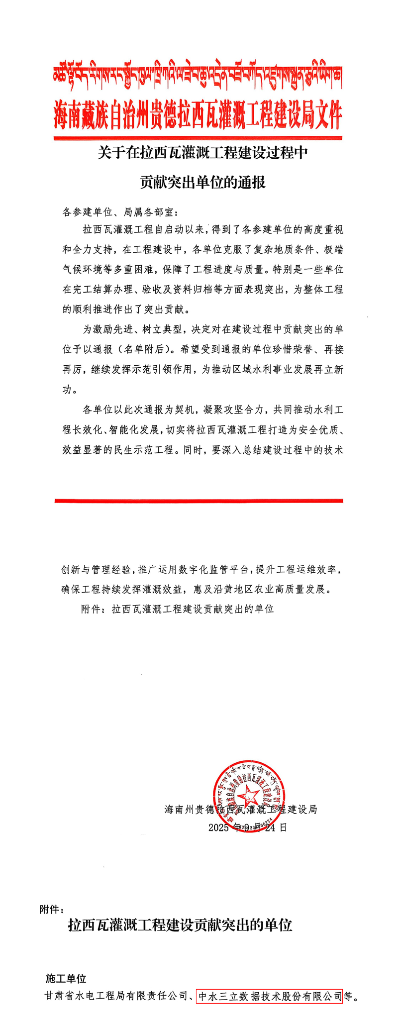 近日,中水三立在水利信息化领域捷报频传。公司承建的青海省贵德县拉西瓦灌溉工程不仅如期兑现关键节点目标,更凭借高交付质量与高效率运管获高度认可,赢得业主表彰通报并给予现金激励!