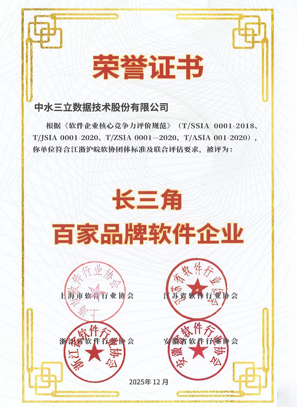 近日,沪苏浙皖四省市软件行业协会联合发布“2025长三角百家品牌软件企业”名单,中水三立成功上榜,成为涉水数智化领域唯一入选企业,充分彰显了公司在软件领域的持续创新实力与卓越实践应用成效!