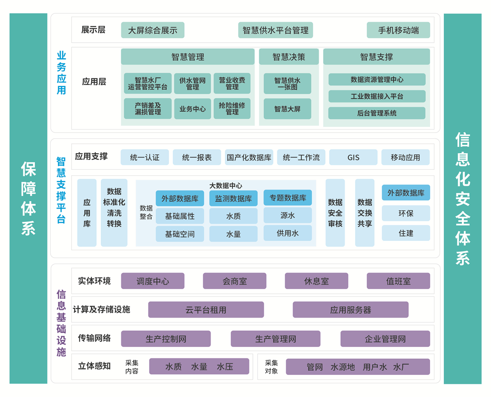 智慧水务平台以信息化安全体系与保障体系为基础支撑,构建多层级架构。信息基础建设涵盖实体环境、计算存储设施、传输网络及立体感知,采集水质、水量等数据。智慧支撑平台依托大数据中心,经数据标准化流转、整合等处理,借应用支撑服务助力应用层运作。应用层包含智慧管理、决策、支撑模块,覆盖水厂运营、管网管理等业务,最终通过展示层的大屏综合展示、管理平台及手机移动端,实现智慧水务全流程管控与高效服务,为供水业务数字化、智能化运营提供全面解决方案。